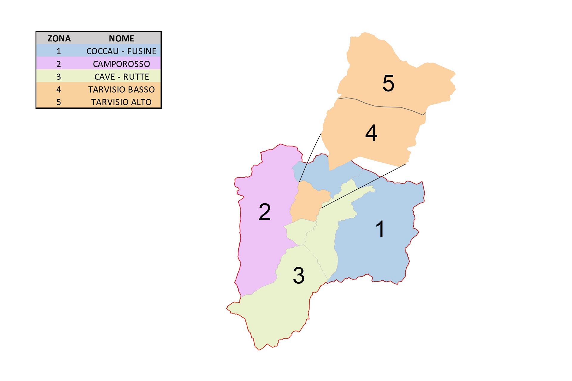 Per pianificare al meglio la sostituzione massiva di tutti i contatori Idroelettrica Valcanale ha suddiviso il comune di Tarvisio in zone omogenee per numero e densità di clienti. Sono state definite 5 zone territorialmente rilevanti come sotto riportate nel grafico. Dal mese di ottobre 2023 i clienti appartenenti a tali zone saranno interessati, in successione, alla sostituzione del proprio contatore sino al completamento del progetto al termine dell’anno 2025.